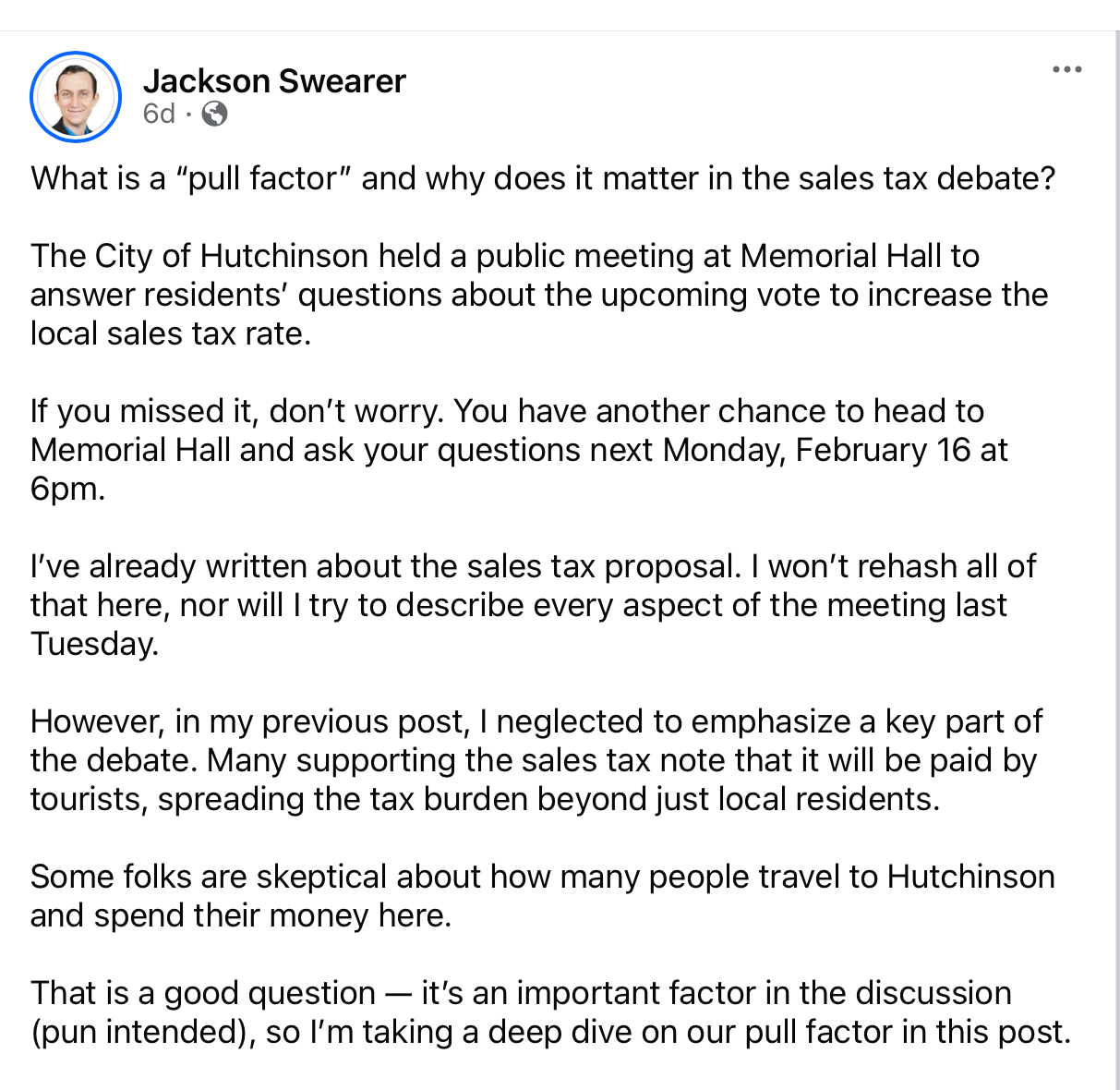 Excellent, Jason. The sales tax vote coming up in Wichita on March 3 isn't at all the same as the sales tax vote coming up in Hutchinson on March 3, but there are more similarities than differences, I think, and your reflections--about hope, trust, confidence, etc.--unintentionally highlight them. I rambled through my thoughts on our sales tax vote (I'm in the "yes" camp) here: https://mittelpolitan.substack.com/p/why-ill-vote-yes-on-wichitas-sales